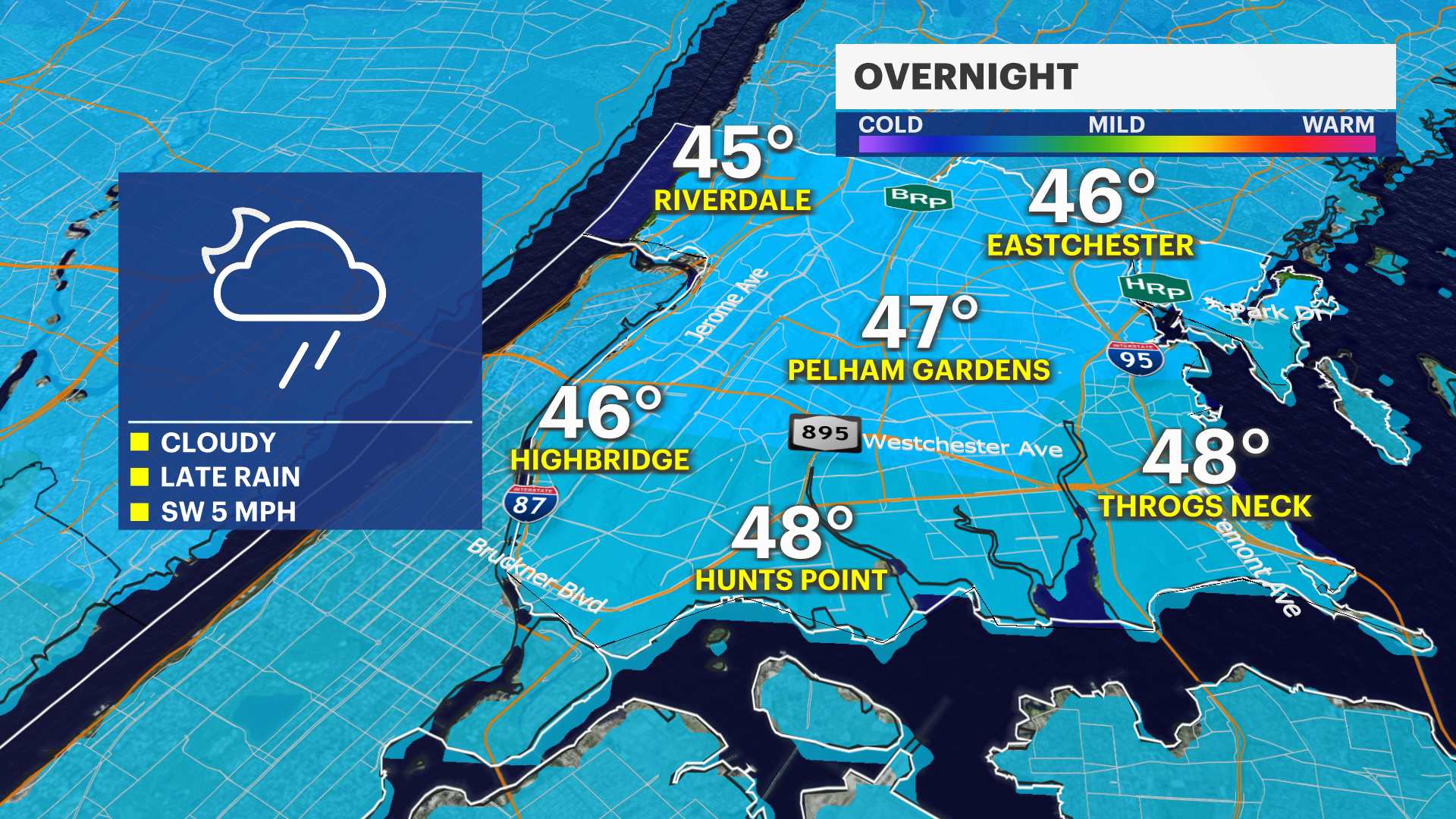 OVERNIGHT: Lows in the low 40s. Rain arrives late.