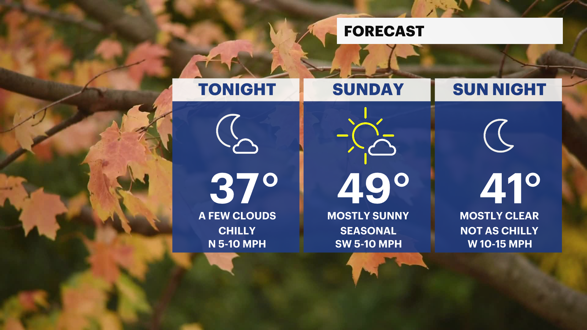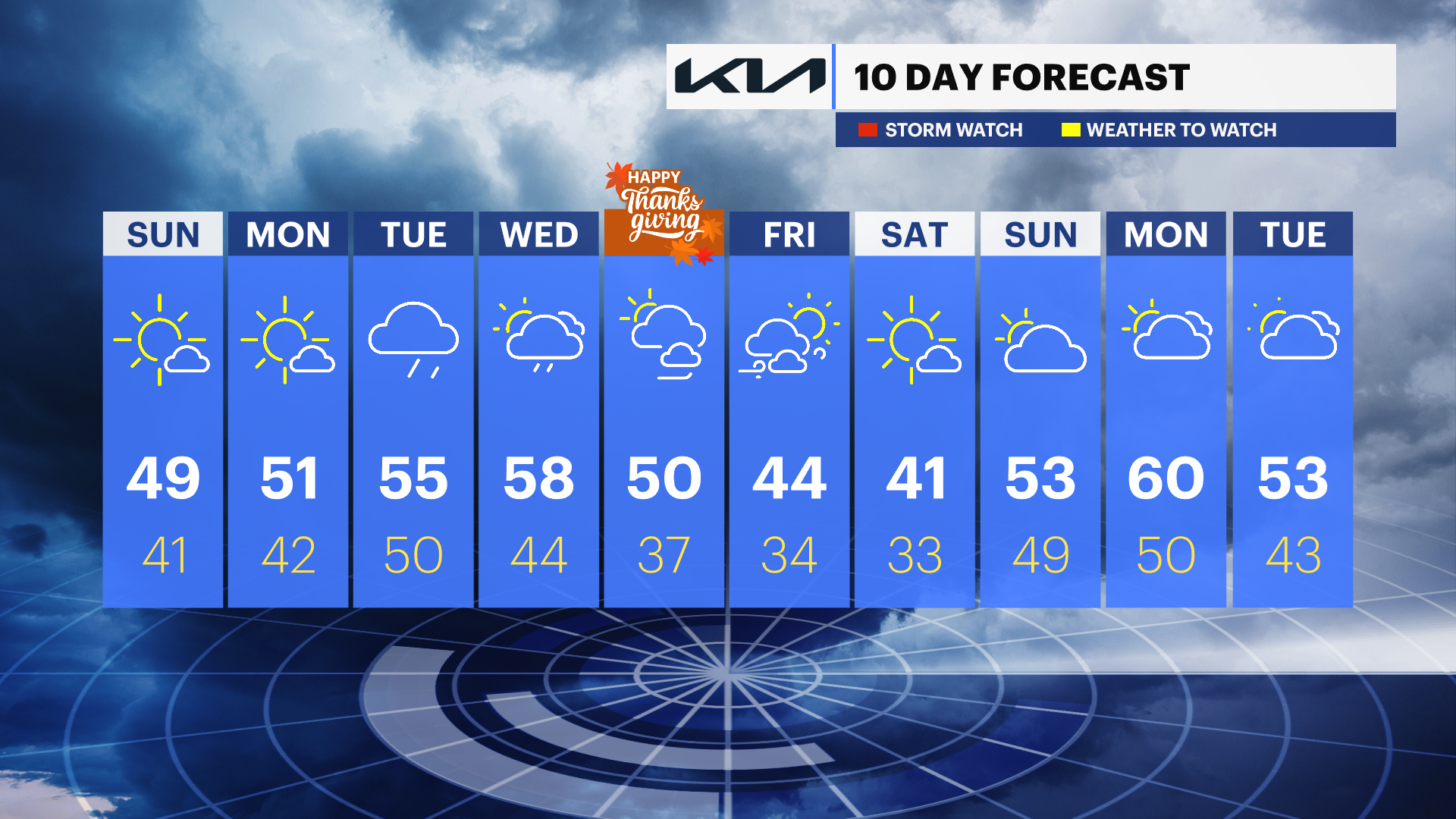 Thanksgiving Day and beyond: Mostly sunny but breezy and cooler for Thursday, with highs in the 40s. Friday and Saturday stay sunny and chilly, holding in 40s.