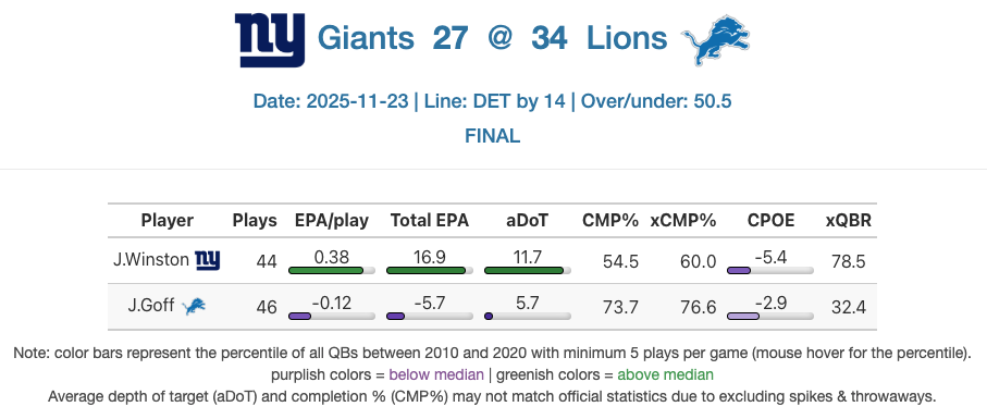 Pass blocking — Winston threw the ball 36 times. Per NextGen Stats, 21 of those were 10 or more yards down the field. The Giants were going VERTICAl. Yet, Winston had plenty of time to throw. The only Detroit sack of the game came on the final play, a desperation fourth-and-5. He was hit only seven times. The line did a fantastic job pass-blocking. To be honest, as the game wore on, it did an increasingly good job creating space for Tyrone Tracy and Devin Singletary to run, as well.