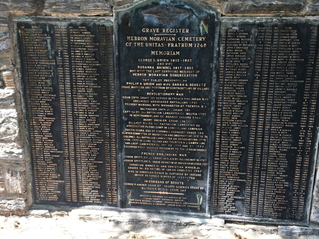 A cement rostrum in the cemetery bears the title “Grave Register Hebron Moravian Cemetery of the Unitas Fratrum (Moravian Church) 1748.”