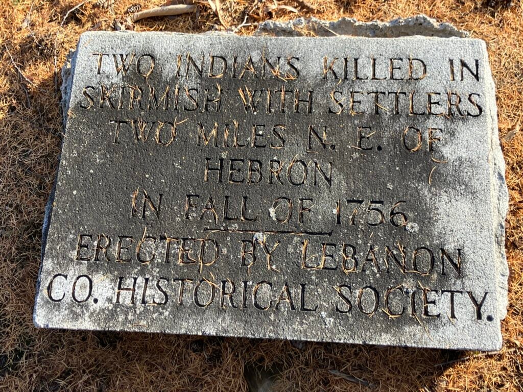 Marker in memory of two Native Americans who are buried in Hebron Moravian Cemetery. The church had a practice of interring individuals even if they were not of the Moravian faith. (James Mentzer)