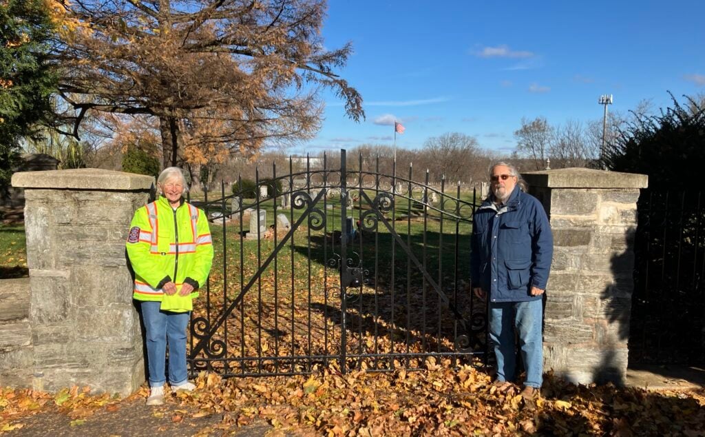 Moravian church members and cemetery historians Susan Dieffenbach and John Klahr at the main gate, which has recently been replaced, at the Hebron Moravian Cemetery in South Lebanon Township. The public is invited to attend a Wreaths Across America ceremony at the cemetery on Dec. 13 beginning at 9 a.m. (James Mentzer)