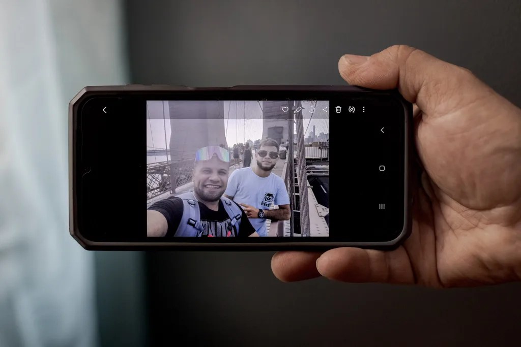 Wilmer Gutierrez, 40, from Venezuela displays a photo of himself with his son Merwil Gutierrez, 19, on the Brooklyn Bridge from the home that they shared in Bronx, NY, on April 4, 2025. Credit: Anna Watts for Documented