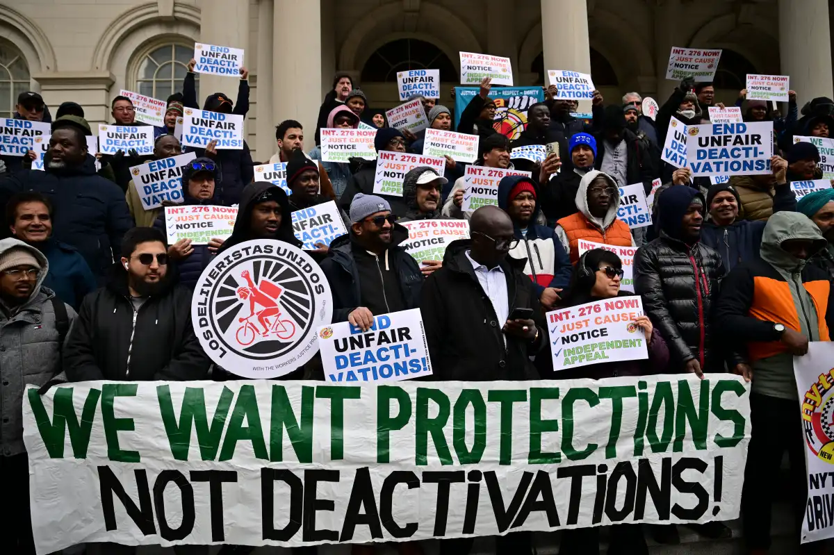 Uber and Lyft drivers who say they were unfairly deactivated by the apps rallying for a bill designed to boost their job protections. Thursday, Dec. 4, 2025.Photo by Lloyd Mitchell