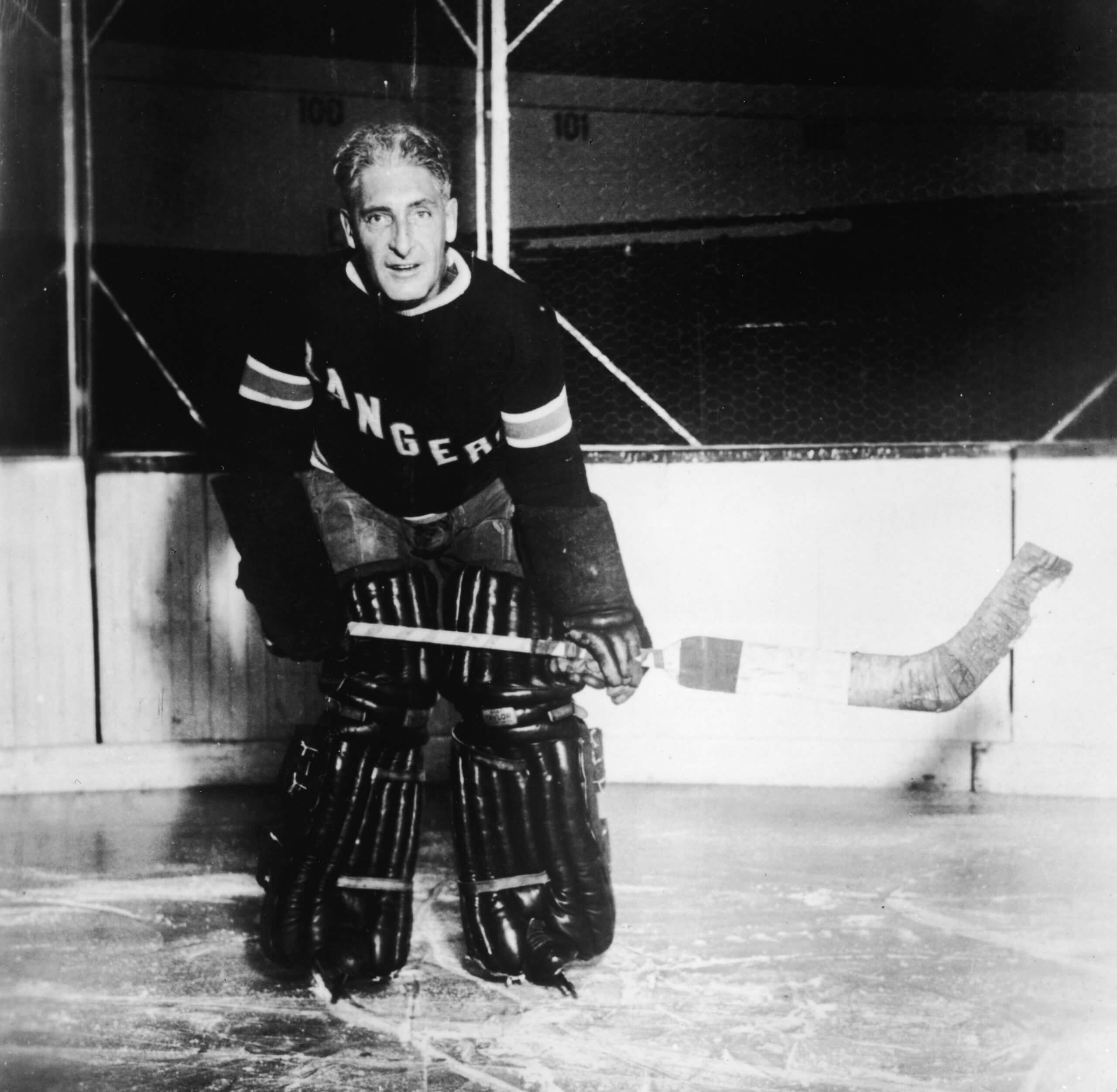 Lester Patrick poses on the ice while wearing goalie gear in 1940. While coaching the Rangers during the 1928 Stanley Cup Final against the Montreal Maroons, Patrick, then 44, was forced to step in as goaltender after Lorne Chabot was injured. (Getty Images)