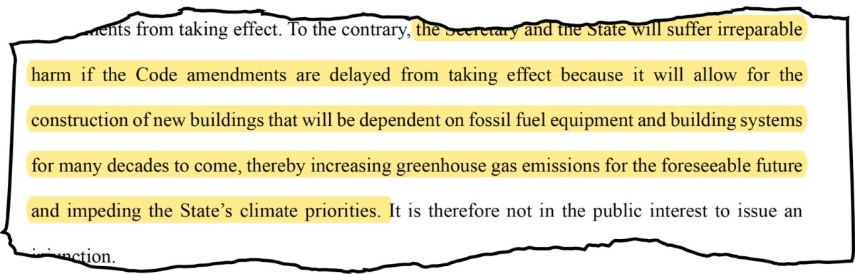 The state countered that it would, because new fossil fuel buildings constructed while the law is on hold would last for decades to come, irreversibly setting back the state’s efforts to meet its legally binding climate targets.