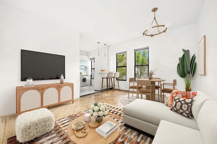 A one-bedroom co-op with nice light and a short walk to Prospect Park. A simple layout with windows in every room — including the nicely sized living room and a bright nook of a kitchen with a dining island. The kitchen itself appears to have gotten a recent-ish renovation with new tiling, a good amount of counter space, and a washer-dryer. The bedroom is king size and comes with a closet and a pair of windows looking out onto leafy Lincoln Place. Maintenance is $1,053 with no real amenities to speak of (there’s a bike room). A decent price for a location that is hot, hot, hot.