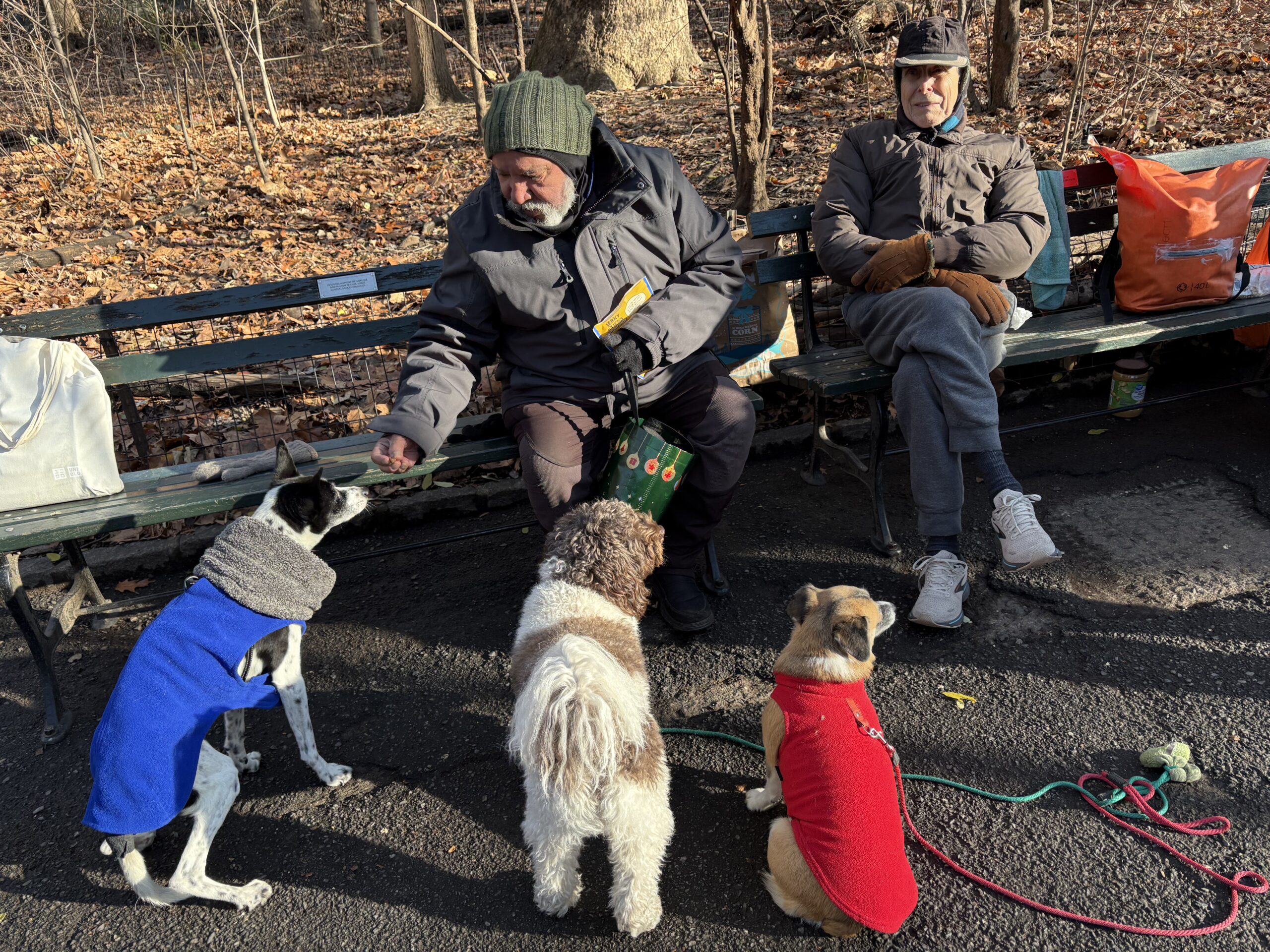 We were lucky that day: we found Armando on his usual bench, surrounded by admirers and well-wishers, and flocks of birds and plump squirrels playing in the trees. One man had brought him a new down vest: “It’s getting chilly,” he said (the high that day was in the 20s). John and I joined the group, and I immediately experienced a feeling of belonging and comfort. I didn’t want the moment to end, was aware that it must, yet still was able to enjoy it – a moment spent with a random group of New Yorkers, all of us chilled to the bone, communing together in Central Park.