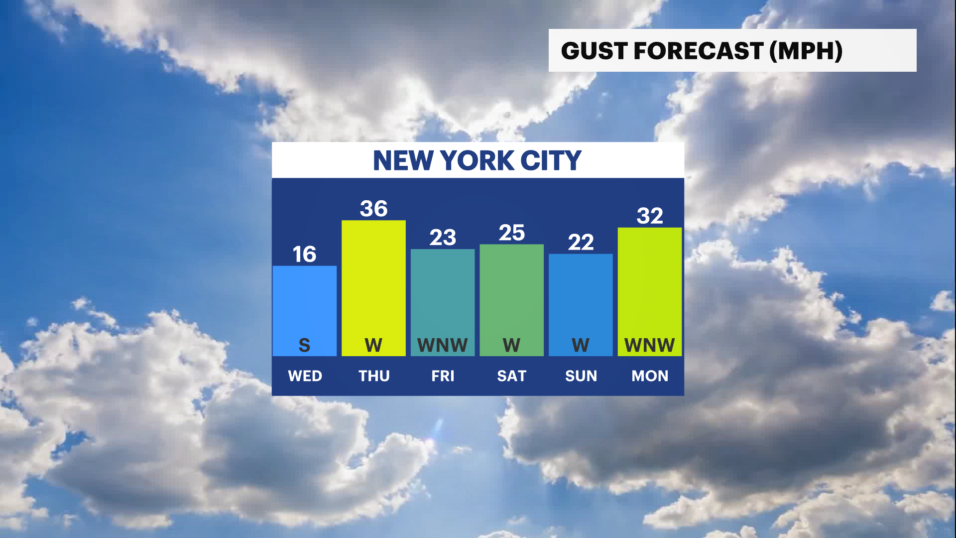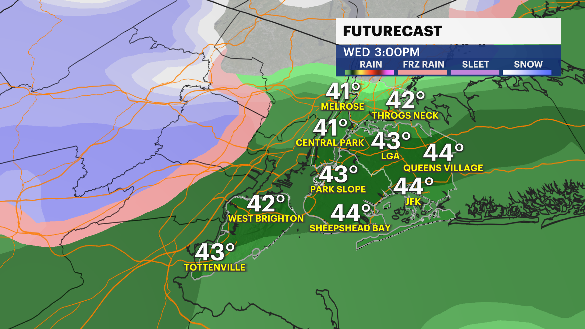Temperatures climb overnight as a clipper system brings light steady showers after 11 a.m. through 8 p.m. tomorrow. There’s a chance for a wintry mix and rain over the Northern edge of the Bronx. Winds pick up through Thursday with gusts up to 35 mph.