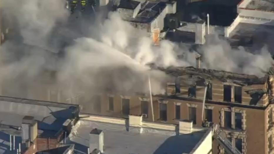 Smoke could be seen billowing from the top of the building early Tuesday morning.Â