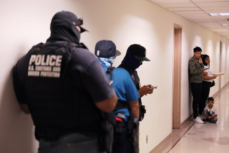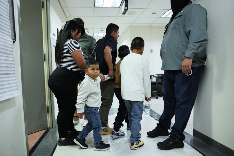 A family waits to enter immigration court as federal agents patrol the halls at the Jacob K. Javitz Federal Building. (Photo by Michael M. Santiago/Getty Images)