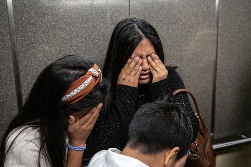 The family of a detained Ecuadorian man cries in the elevators at Federal Plaza (Photo by Stephanie Keith/Getty Images)