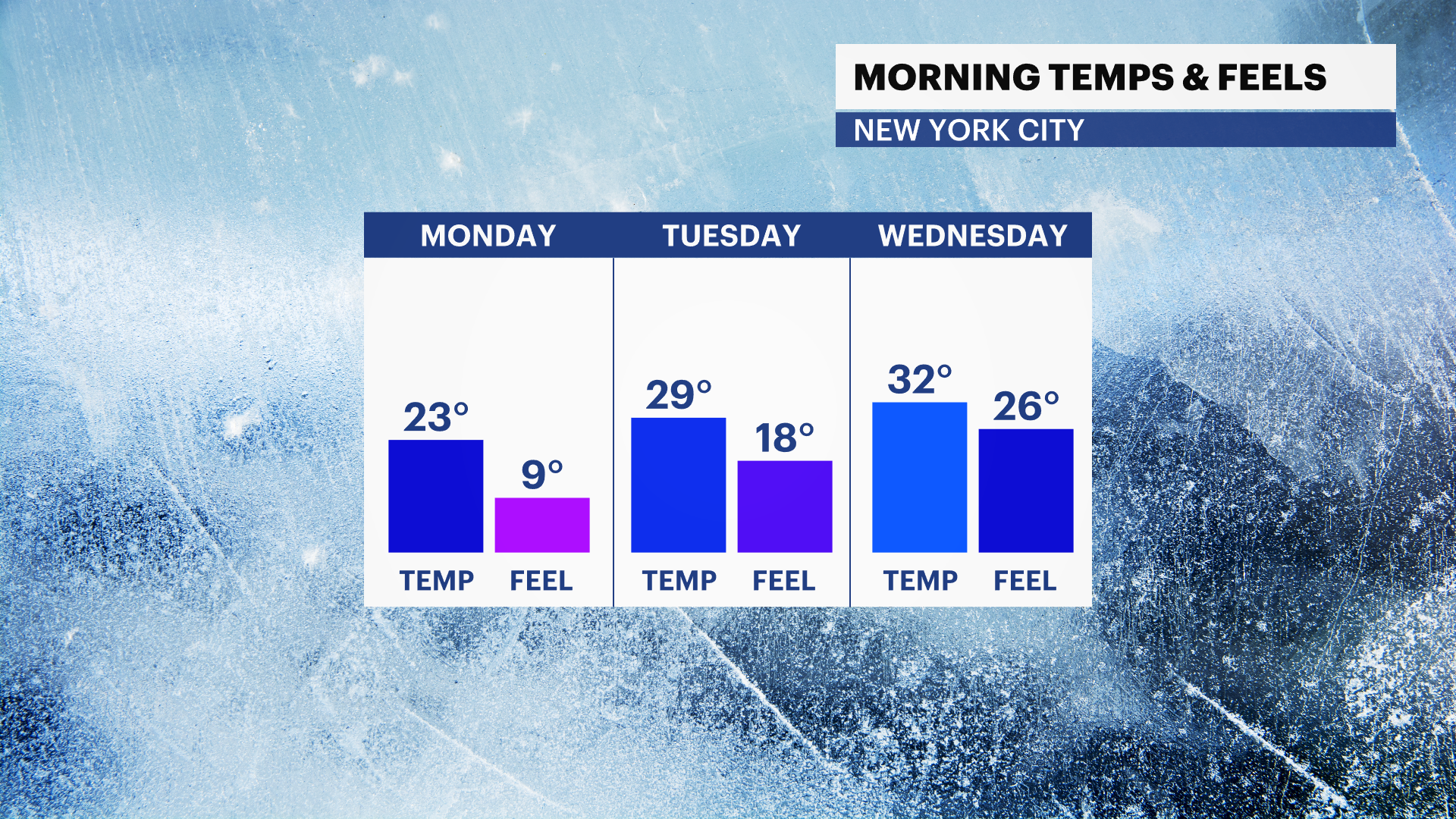 Monday: Frigid start! Mostly sunny, bone-chilling with brisk winds. Highs near 29. Lows near 26.