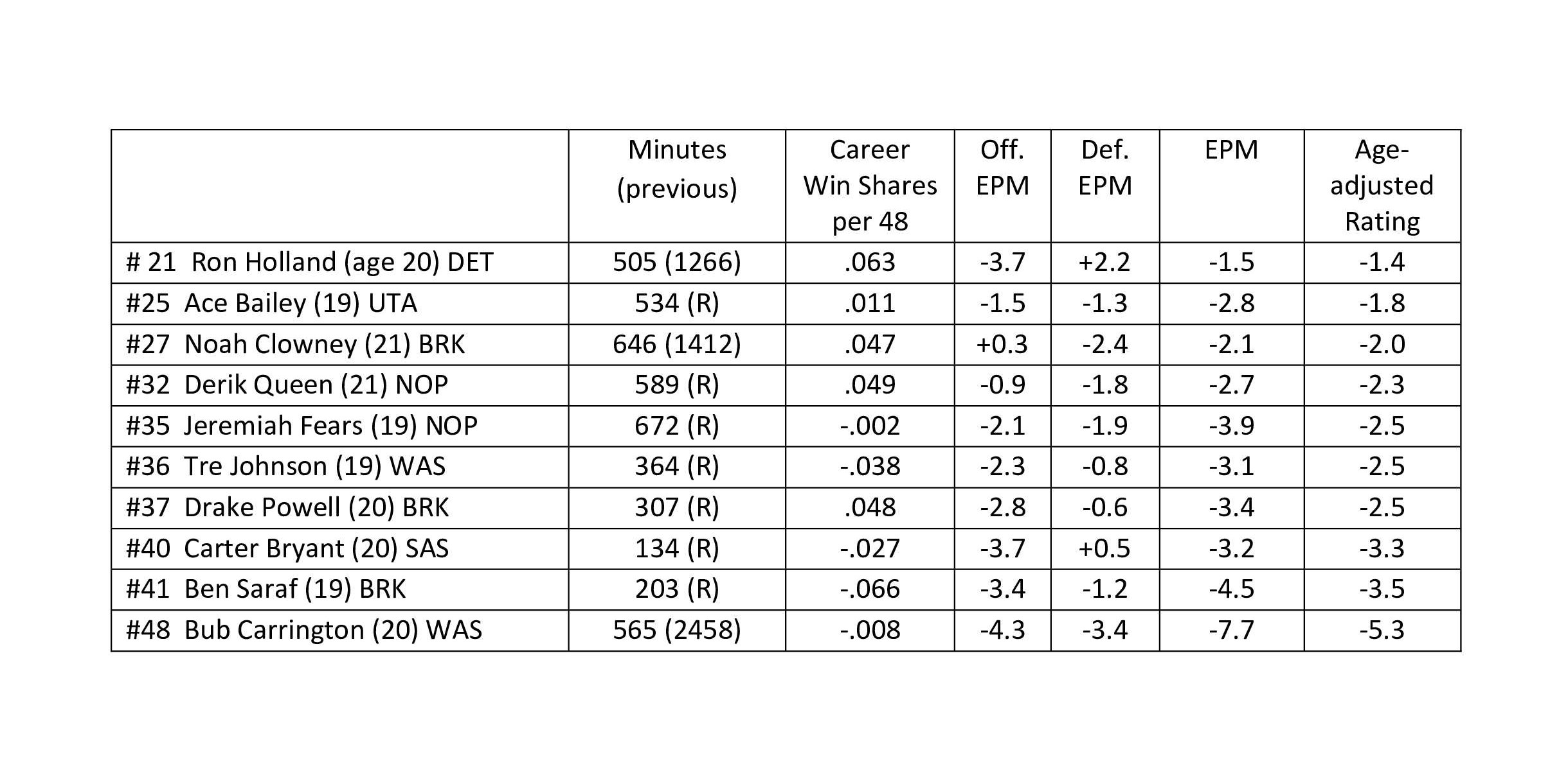 minutes, including Khaman Maluach, Noa Essengue, and the Nets’ Nolan Traore, among others. On the other hand, I include young players from previous draft classes, some of whom have considerable NBA experience. One of those is Noah Clowney, who is 70 days younger than Danny Wolf but had already played 1,412 minutes coming into this season.