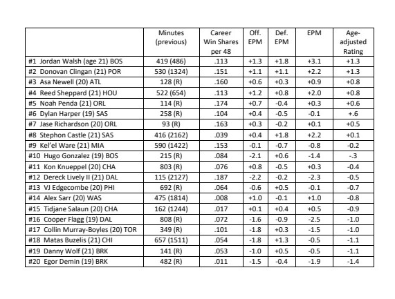 Richardson—have also played sparingly, so their ratings are especially uncertain. The same might be said for the Nets’ top-rated rookie, Danny Wolf, with just 141 NBA minutes under his belt. Wolf was a late-first-round pick (27th) and began the season in the G League. So far in his brief NBA career, however, he has seemed to be not bad offensively and a better-than-average defender, placing him 19th in my adjusted ranking.