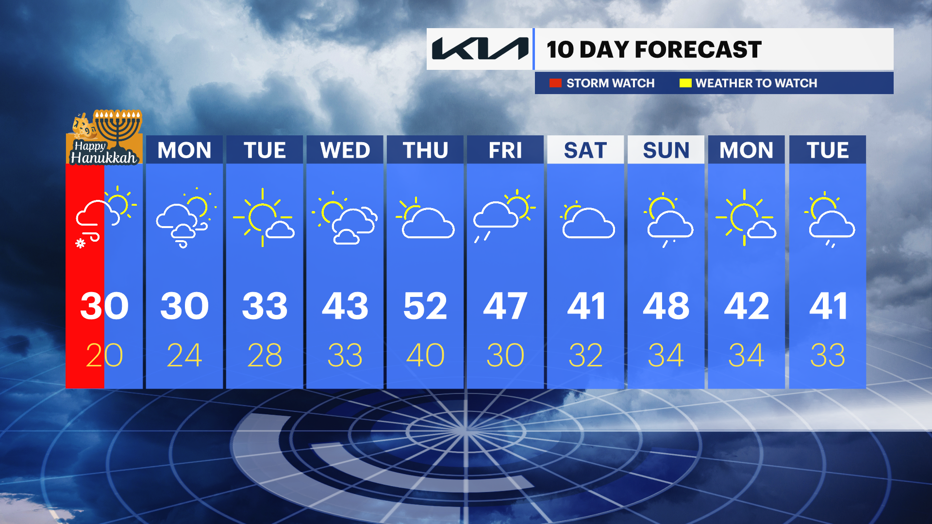 Monday: Cold and blustery with increasing clouds. Highs in the upper 20s to low 30s.