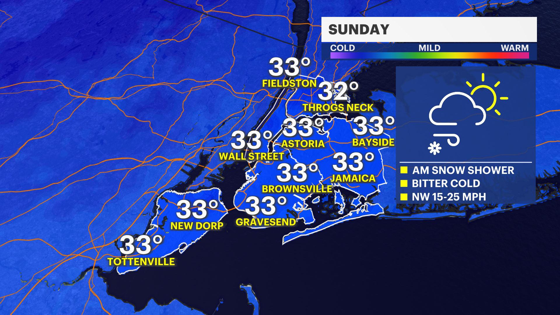 Tuesday: Mostly sunny and cold, highs in the low to mid-30s.