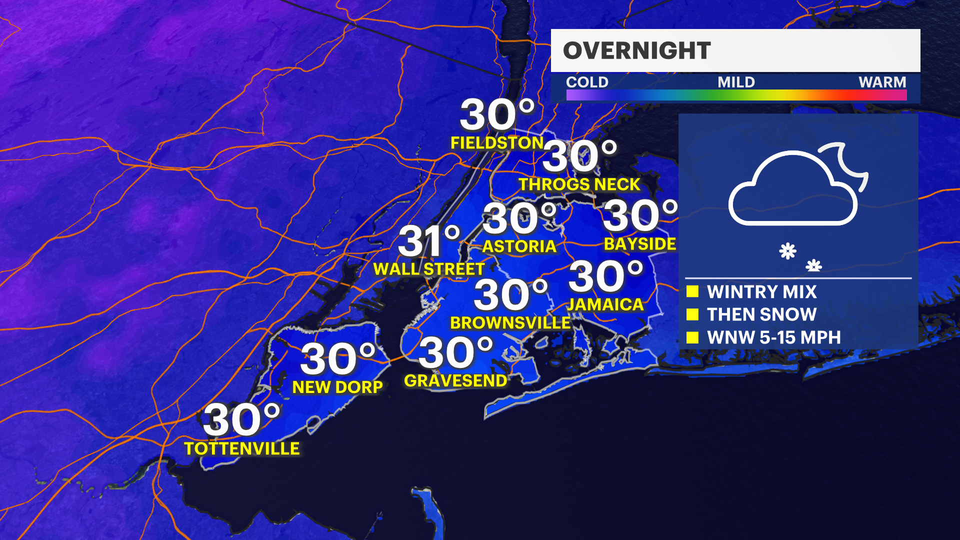 Tonight: Snow develops late, becoming steady overnight. Total snowfall around 1-3 inches by early morning.