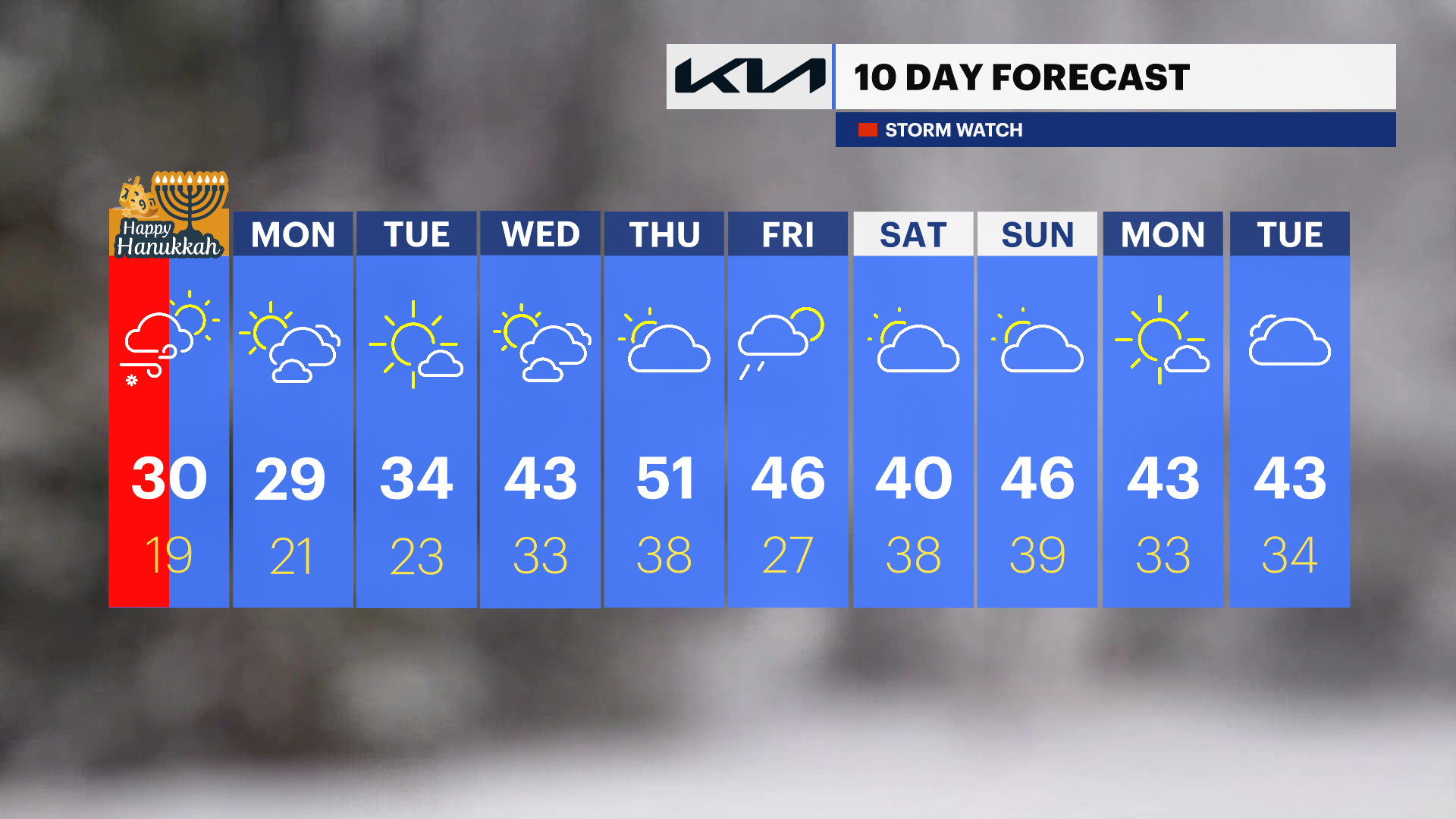 Monday: Cold and blustery with increasing clouds. Highs in the upper 20s to low 30s.