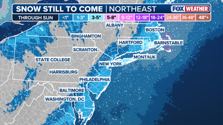 NEW YORK – Snow is still falling across New York City, New Jersey and southern Connecticut this Sunday morning, with several inches of accumulation expected to continue as winter weather advisories remain in place.
