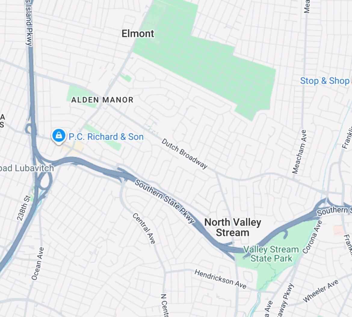 A Google Maps view shows the Southern State Parkway near Exit 13 in North Valley Stream, close to the Elmont border, where a fatal crash was reported early Sunday morning.