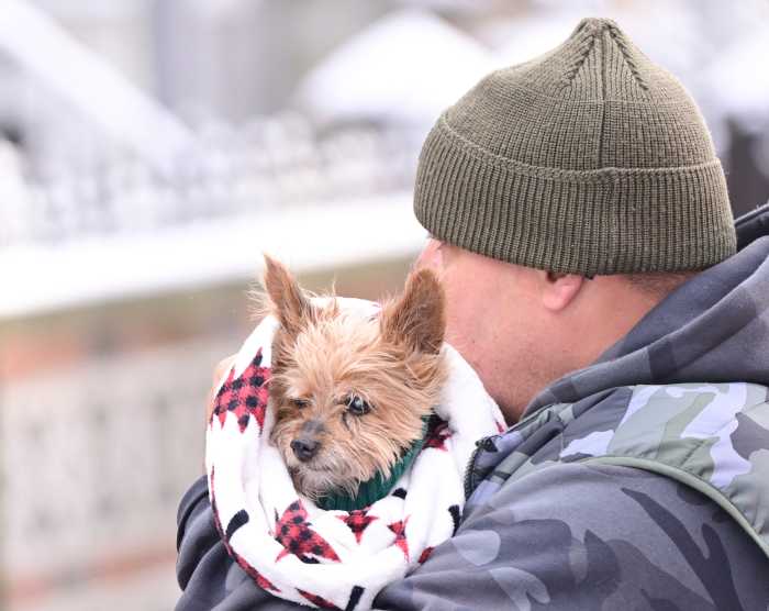 A resident stands outside in freezing temperatures holding a pet after being displaced.Photo by Lloyd Mitchell