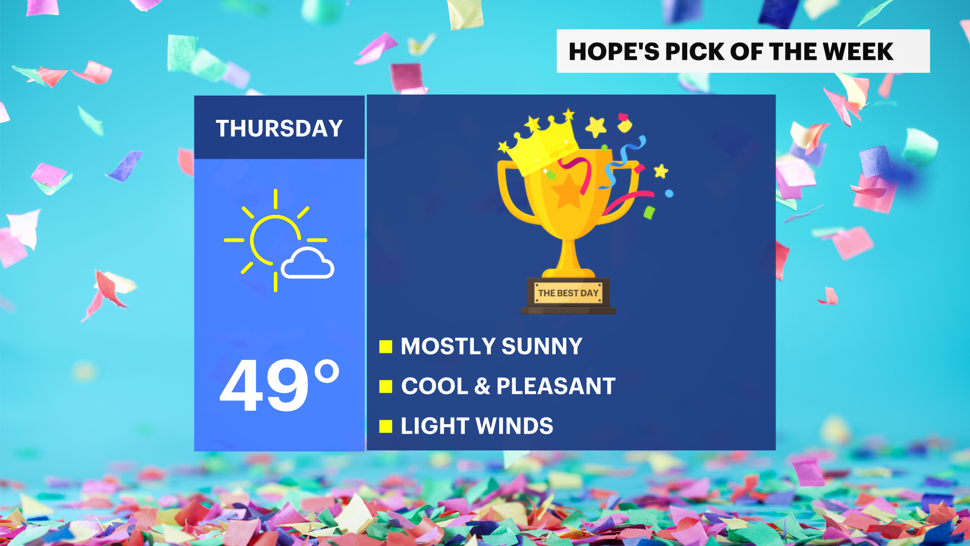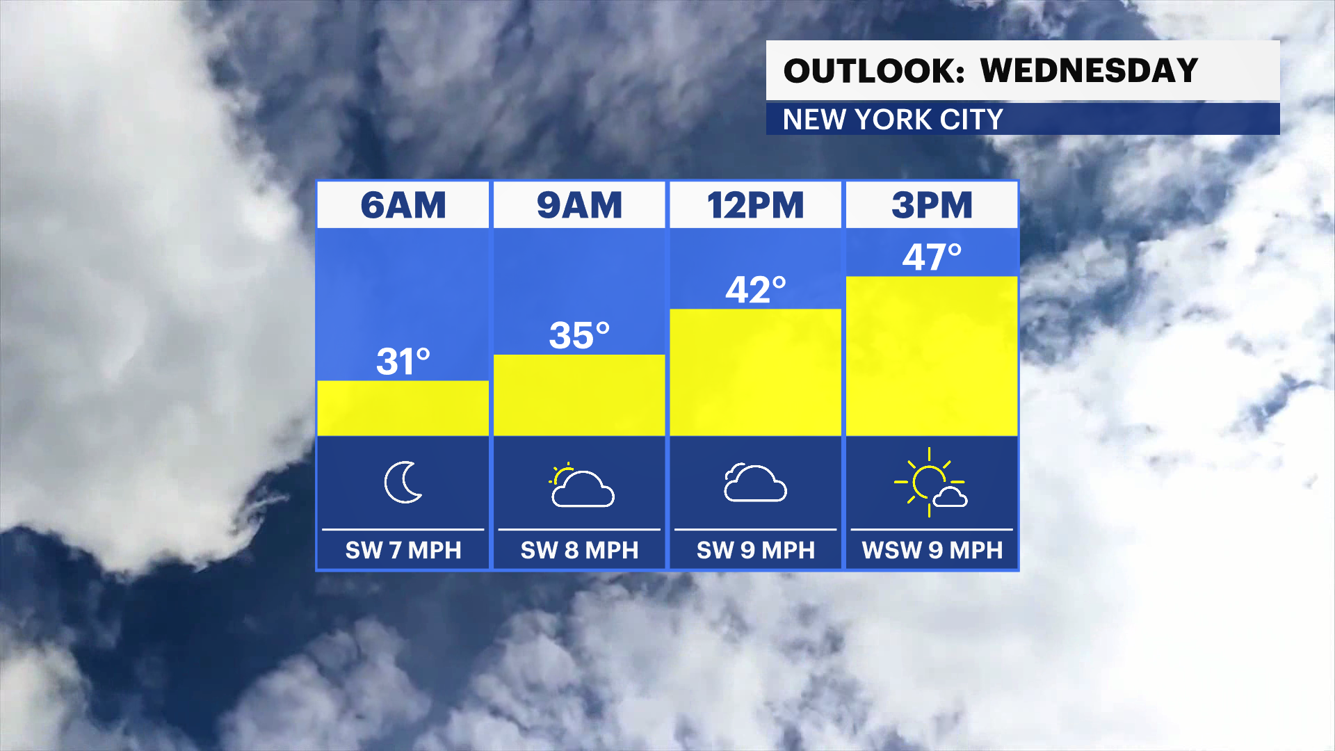 Wednesday: A big improvement. Mostly sunny and not as cold. Winds pick up. Highs near 46. Lows near 32.