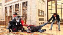 Plaza Hotel employees help reenact a scene from the movie “Home Alone” as part of the hotel’s partnership with the Make-a-Wish Foundation. (Credit: Plaza Hotel)
