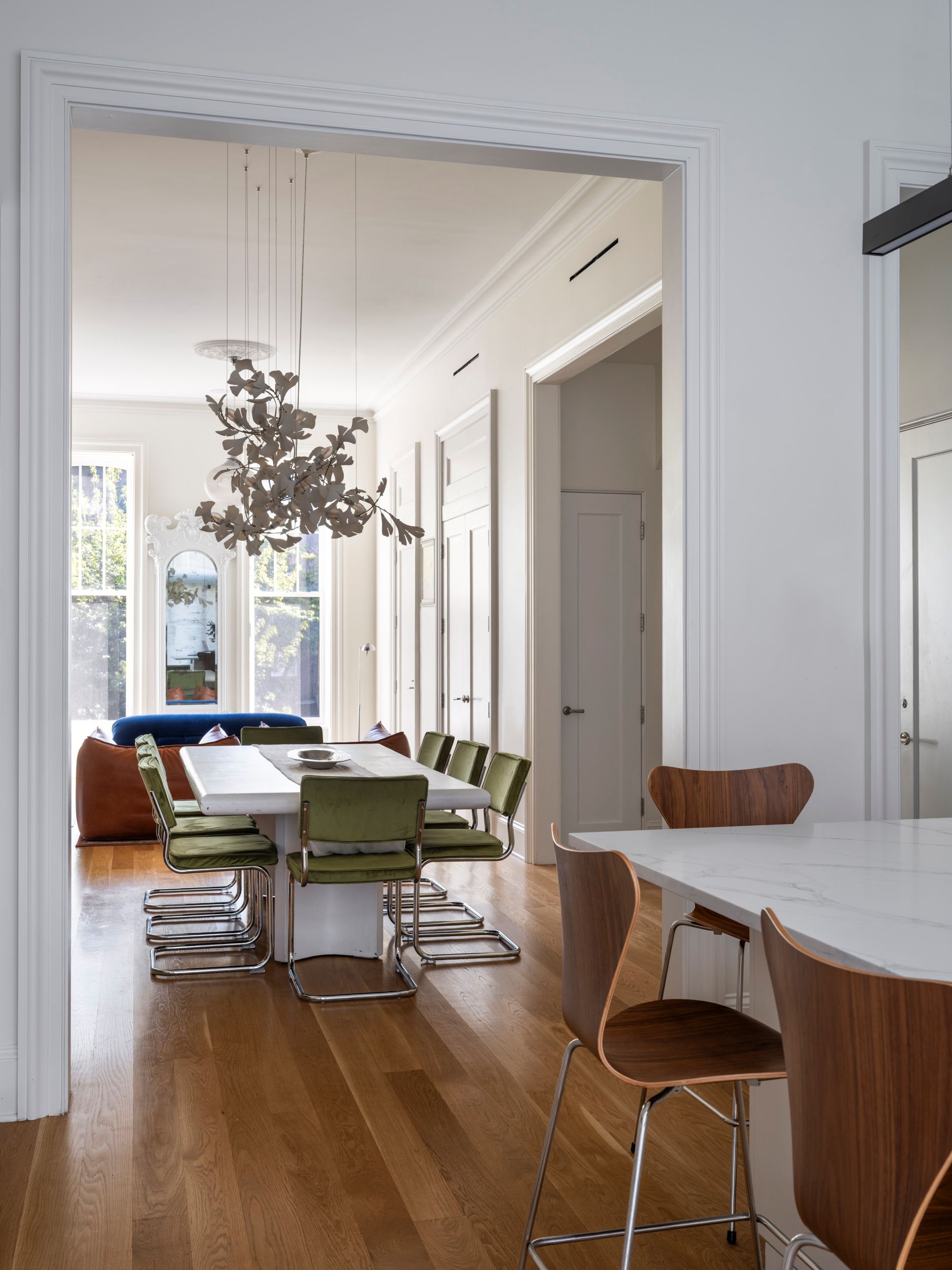 The paintings in the dining room are the work of local artist Francis Di Tommaso; the sculptural porcelain light fixture above the table is a custom piece by Andreea Braescu.
