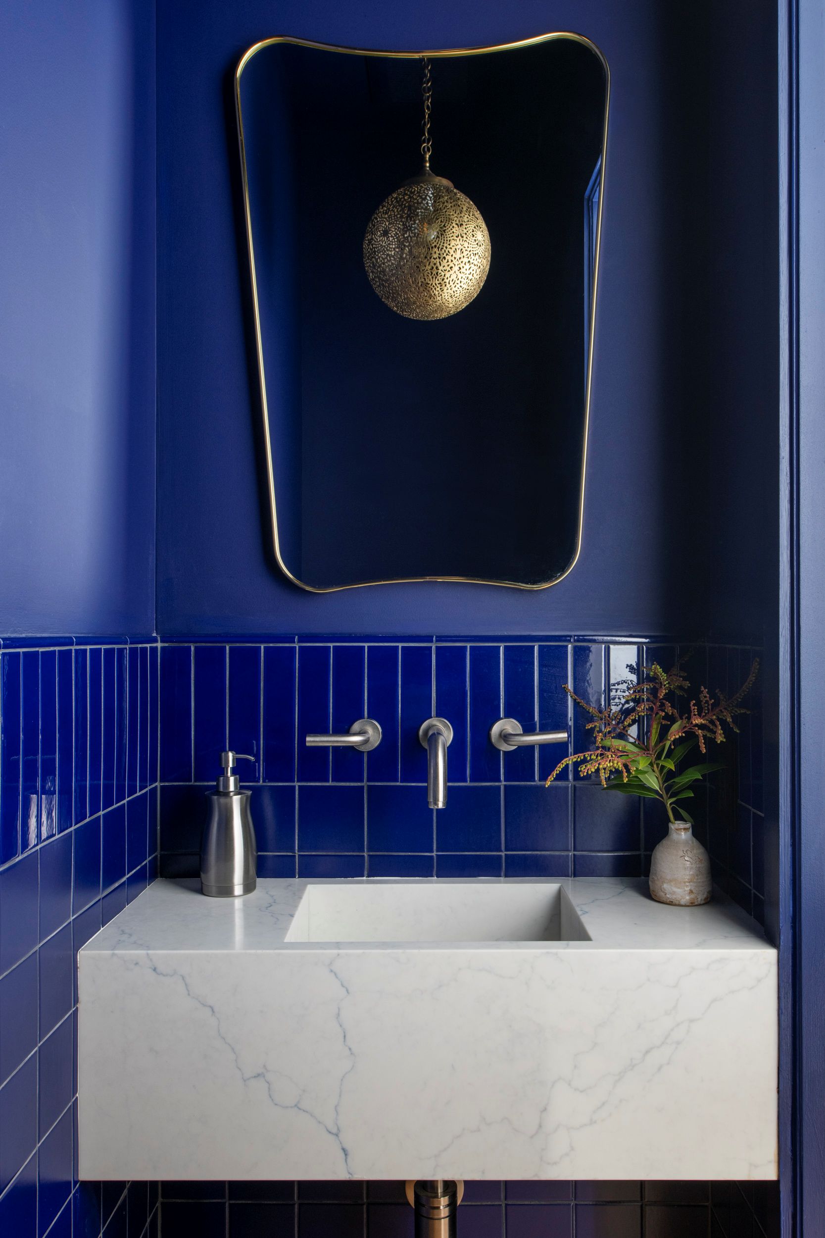 Gleaming blue tile and a sink of solid marble, along with a Moroccan brass pendant found on Etsy, make a standout of the parlor floor powder room.