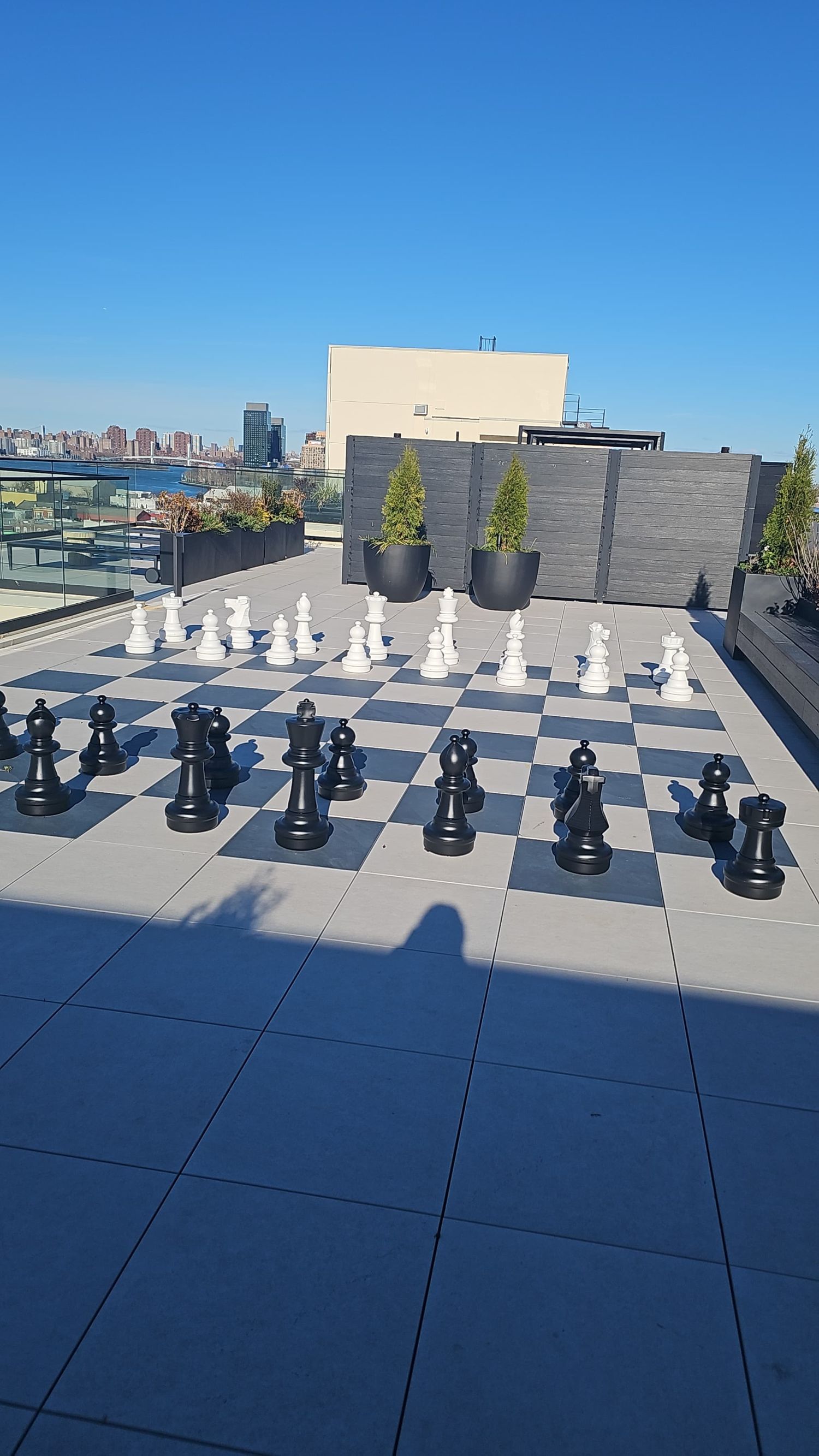 A giant chess table is set up on the rooftop terrace. Photo courtesy of NYC Housing Connect