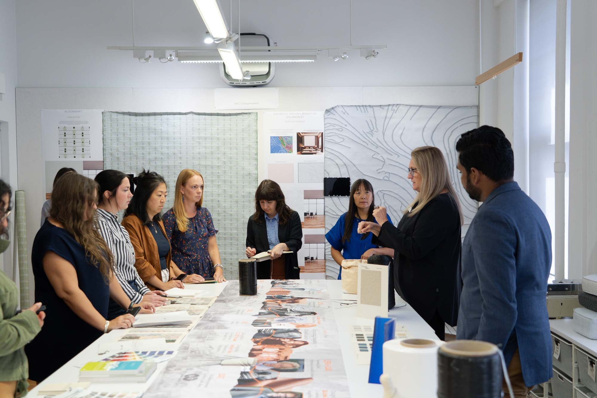 Following Boggis’s remarks about the power of responsible material selection, the participants explored the company’s textile and acoustical solutions with chief design strategist Mary Holt and VP of acoustic solutions Dana Pucillo, gaining insight into Carnegie’s long-standing commitment to sustainable, performance-driven materials. The group then toured the studio with chief creative officer Heather Bush, met members of the Creative team, and discussed how responsible product development can shape the future of the built environment.