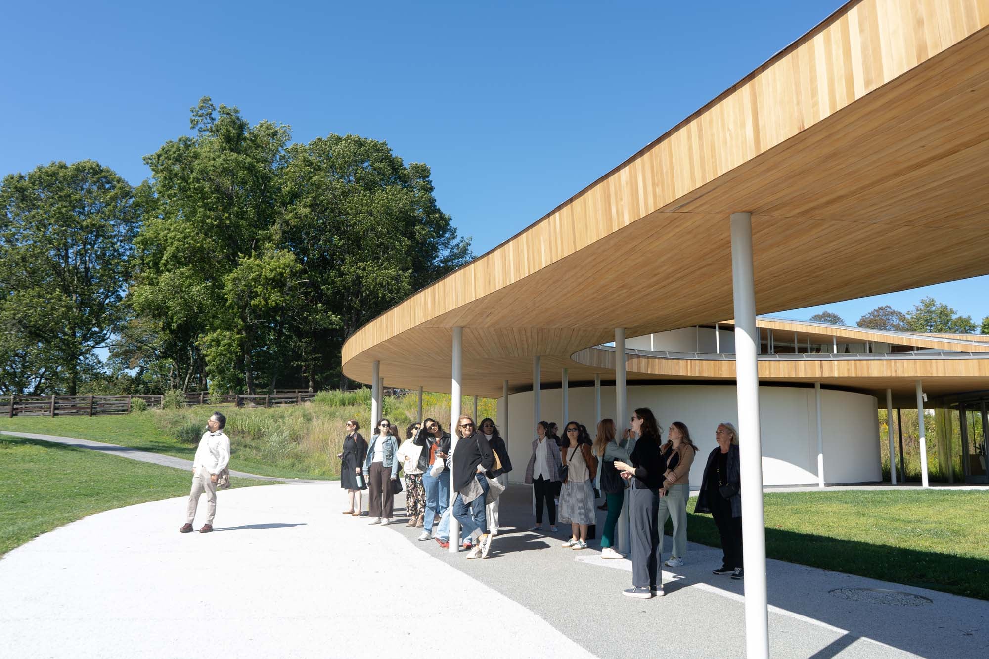 The following day, the group set off to New Canaan, Connecticut, for a full-day immersion at Grace Farms Foundation and an introduction to the Design for Freedom movement, which seeks to eliminate modern-day slavery in the supply chain of buildings. The visit began with an introduction to the foundation’s mission to advance good through nature, arts, justice, community, and faith. The group then toured the River Building designed by the Pritzker Prize–winning architects SANAA, with its glass-enclosed volumes, seamless roofline, and deep integration with the surrounding landscape. Resident tea master Frank Kwei offered a moment of pause and contemplation with a tea ceremony, using ethically sourced ingredients to underscore broader themes of transparency and responsibility in how we consume materials and products. Grace Farms’ Nora Rizzo, ethical materials director, and Brigid Abraham, senior project manager, then presented on Design for Freedom, providing practical guidance on ethical sourcing and material transparency, and encouraging participants to consider how these principles could be applied within their own practices; rounding out the idyllic day with plenty of food for thought.