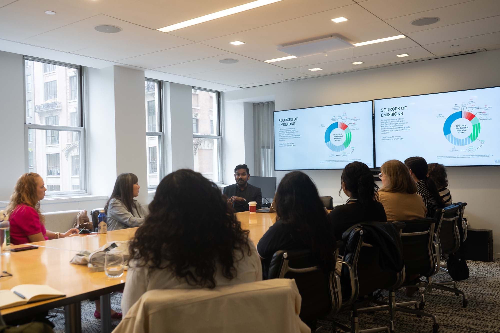 On the following morning, the participants were hosted by HOK for a candid roundtable discussion about product specification and material vetting. The session kicked off with a special presentation by Candon Murphy, HOK’s firmwide material resource manager, who provided behind-the-scenes insights into the firm’s sustainable materials tracking initiative. METROPOLIS editor in chief Avinash Rajagopal then presented on the history of materials transparency and alignment in the A&D industry, showing the group how and why today’s systems centered around the A&D Materials Pledge and the Common Materials Framework were created. “There are always multiple pathways to achieving similar goals,” he reminded the group, “which means that there is so much room for creativity and expression even in sustainable materials selection.”