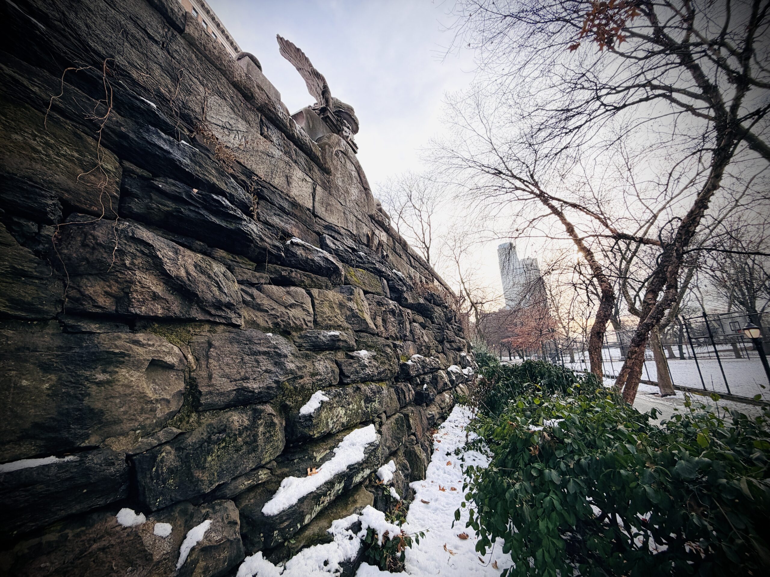 There’s still one more curious layer to the story. The fountain, embedded in a wall along the sidewalk, is widely thought to have been a horse trough. But historian Tom Miller points out that on the other side of that wall, down in the lower part of Riverside Park, there used to be a small marble bowl. Could that have been the part meant for the horses? Did they never drink from this stunning fountain after all?