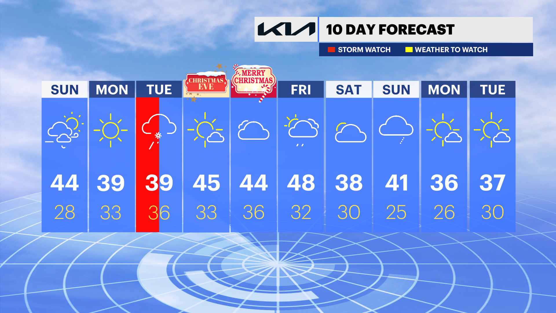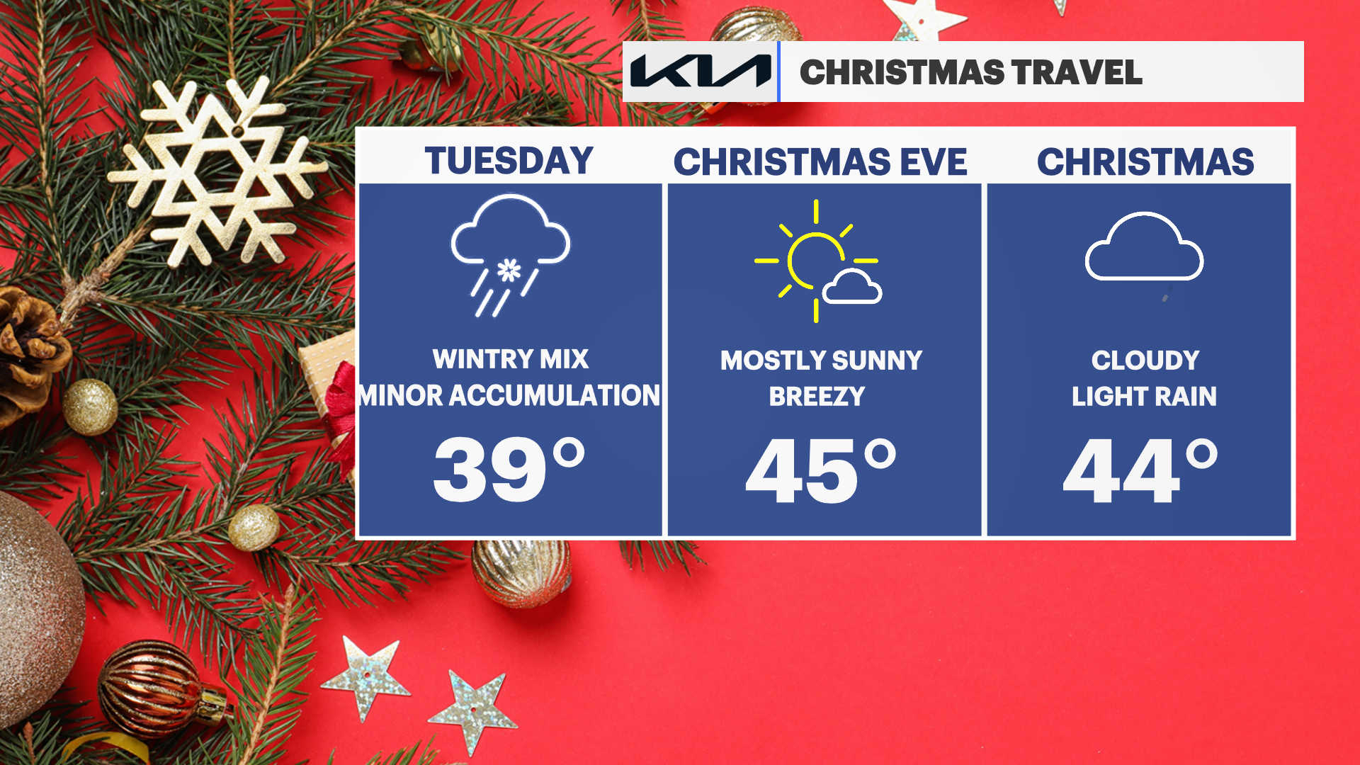 It’s a mild start to the day today, but a cold front will move through mid-afternoon and drop temperatures this evening. It’s a cold and dry Monday. Keep an eye on Tuesday, rain and snow showers are expected and cloud slow travelers down. Wednesday looks bright and mild for Christmas Eve plans. Christmas Day will be cloudy with a stray rain shower, but temperatures will remain above freezing, so slippery conditions are not expected at any point at the end of this week.
