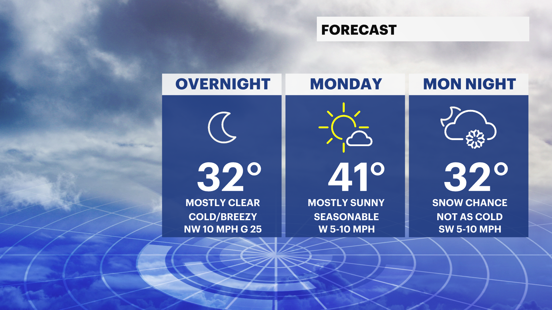 Tonight: Mostly clear and cold with lows in the upper 20s to low 30s. A brisk northwest breeze will keep wind chills feeling colder.