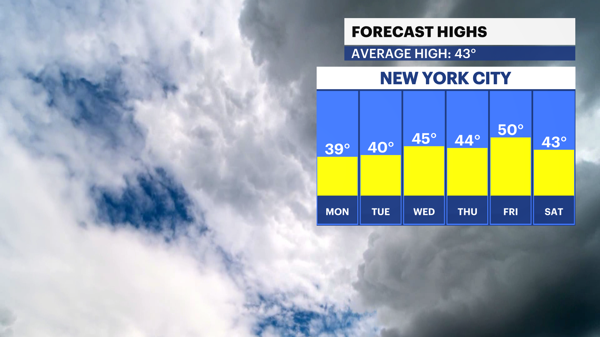 Monday: Sunny and chilly. Afternoon highs range from the upper 30s to near 40, with a light west breeze.