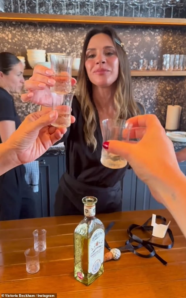 Taking to Instagram she cheersed her shot and joked to the team at her fashion and beauty brand: ‘Cheers to me! Enough about me what do you guys think about me?’