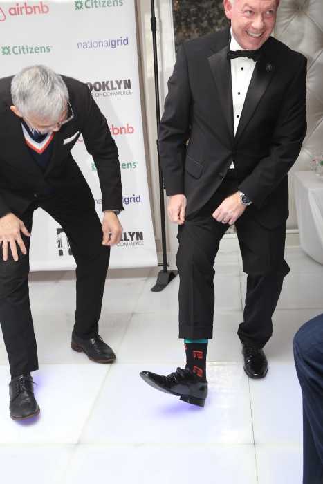 businessThe Brooklyn Chamber of Commerce’s gala was held at El Caribe in Mill Basin.Photo by Arthur de Gaeta Brooklyn Chamber of Commerce President and CEO Randy Peers shows off his socks, purchased at Brooklyn Made, to Assembly Member Lester Chang.Photo by Arthur de Gaeta