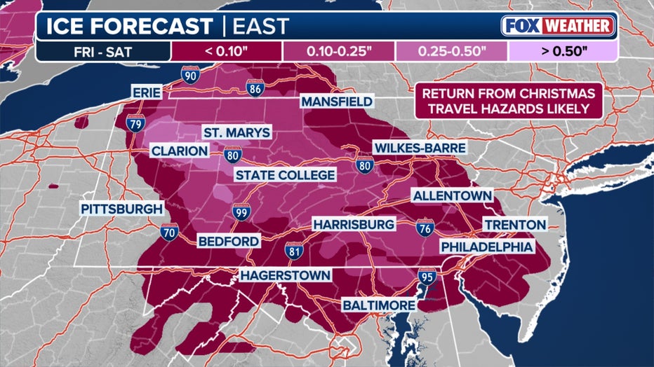 Forecasters say early Saturday morning could also bring a brief mix of sleet or freezing rain as warmer air pushes north and collides with cold air spilling south from Canada, particularly between Philadelphia and New York City.