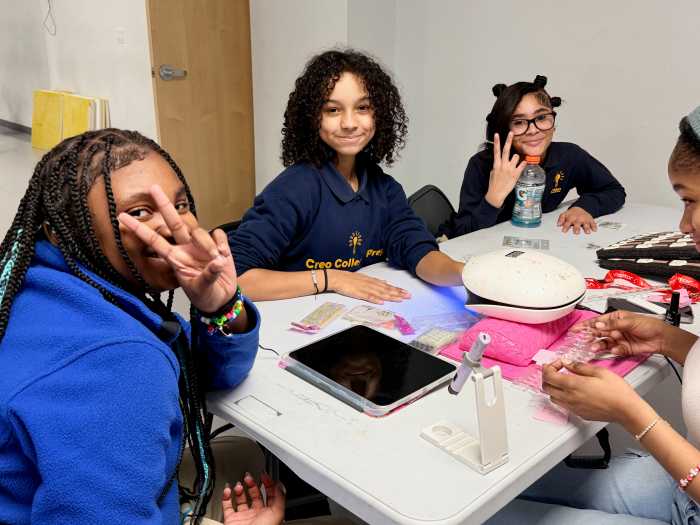 Middle schoolers Akhiya Fields Clarke, Maya Ortiz and Ariana Rodriguez get their nails done as a part of Creo College Prep’s self-care day. Photo by Claude Solnik