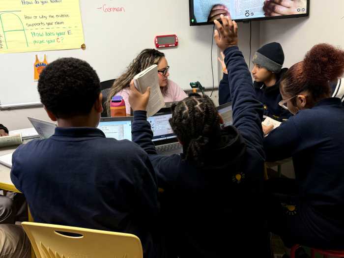 Ms. Olivia Comm leads her 7th grade English seminar. Photo by Claude Solnik