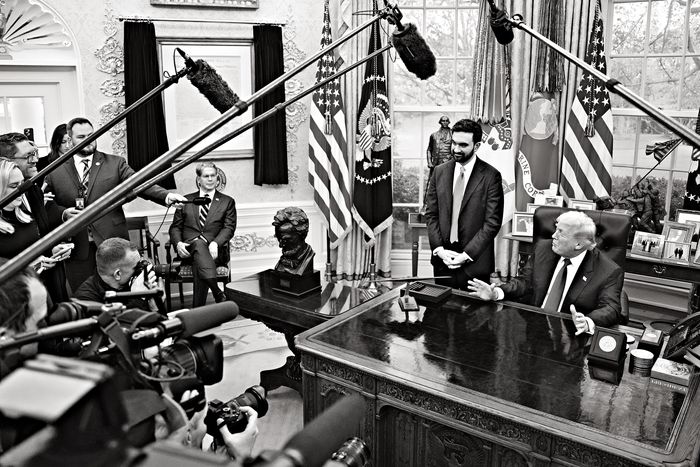 In D.C., he holed up in a hotel with three of his closest aides: Bisgaard-Church; Dora Pekec, his press secretary; and Morris Katz, the top strategist on the campaign. They spent the morning rehearsing for the meeting, running through various possibilities. Would they get the Trump who can be gracious to guests like the old hotelier that he is? The one who would want to pick a fight with the new political star from New York, knowing it would fire up his base? The one who would call him a communist or insult Mamdani for his Muslim faith? Would Trump be one of these things in private and then flip when the cameras arrived? They practiced over and over with the 26-year-old and slightly built Katz playing Trump and Pekec playing the press, coming in when summoned. Their plan was to not take the bait, to just keep returning to the issue of affordability no matter what the president said.