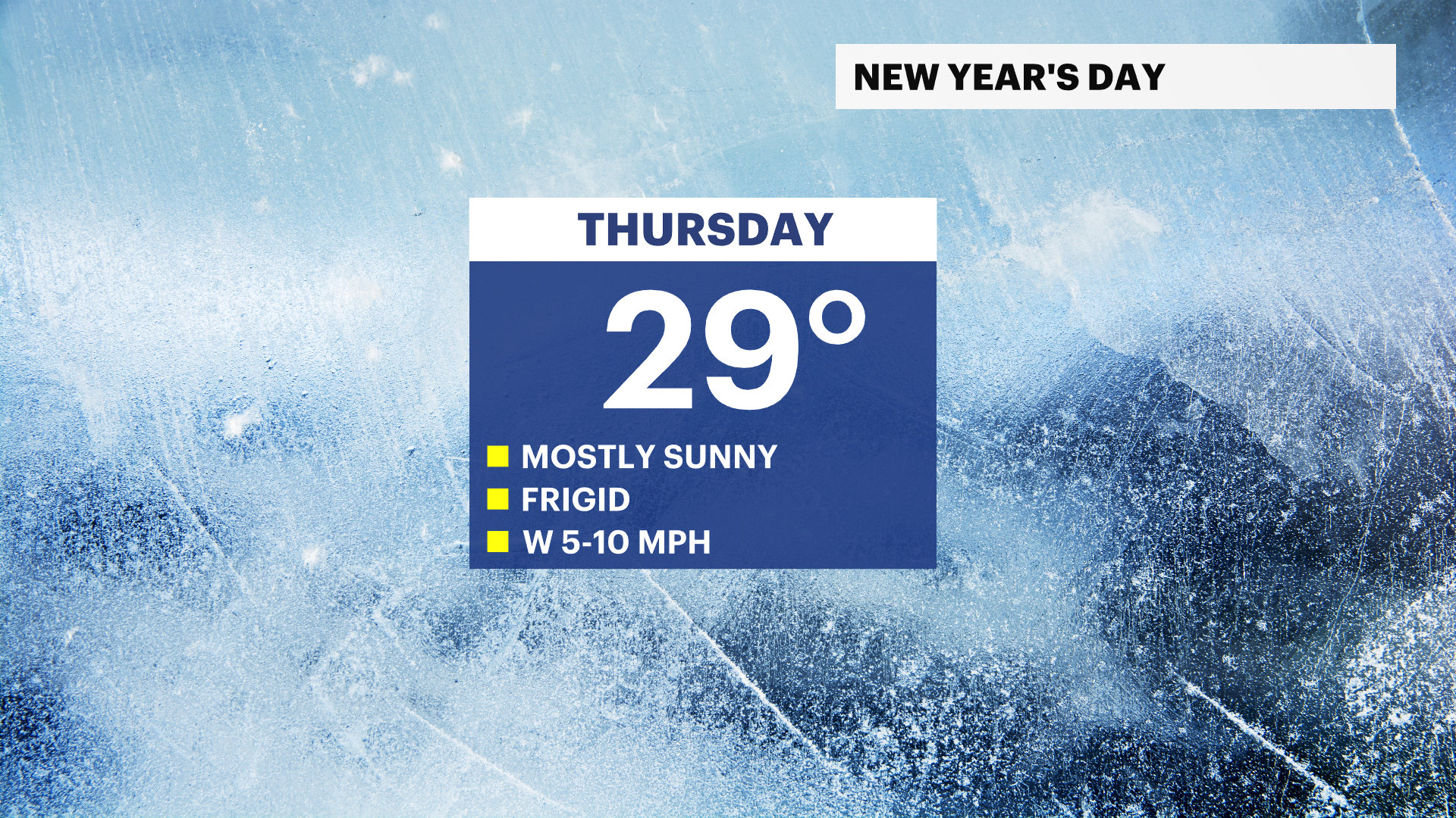 New Year’s Day: Mostly sunny and frigid. Highs near 29. Lows near 19.