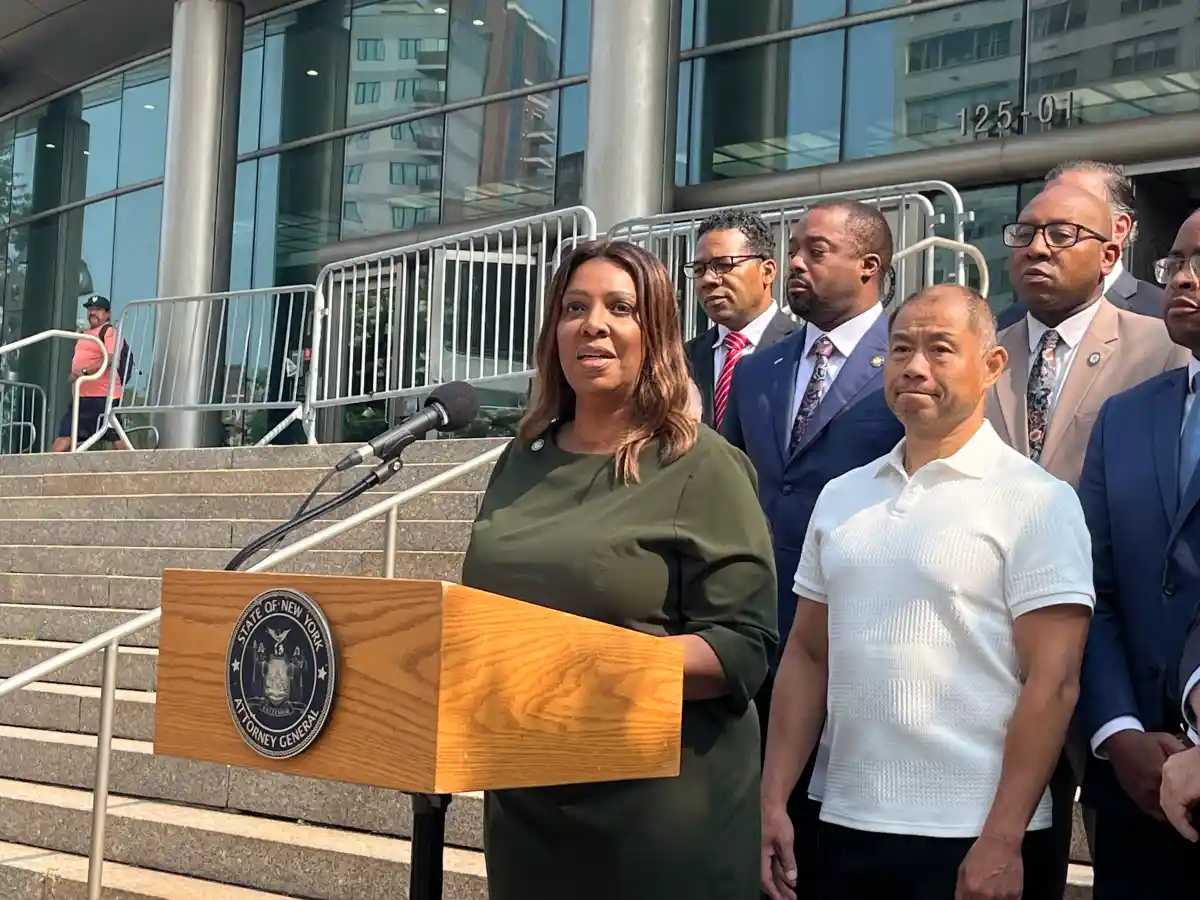 New York State District Attorney Letitia James held a press conference on Aug. 7 detailing the first criminal case under a recently passed legislation that criminalizes deed theft.