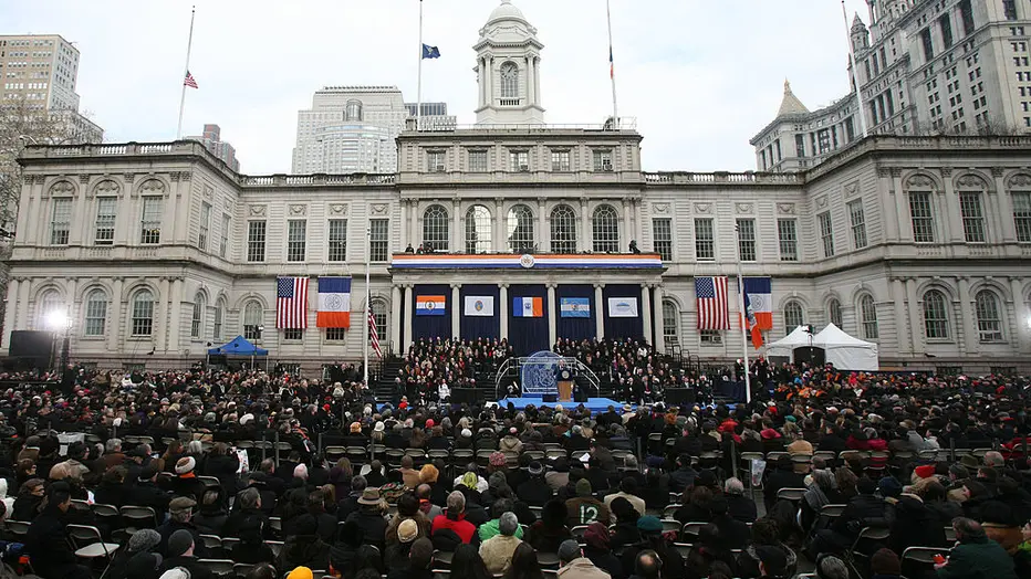 NEW YORK – JANUARY 1: Crowds listen to New York City Mayor Michael Bloomberg’s inaugural speech after he took the oath of office administered by New York State Chief Judge Jonathan Lippman January 1, 2010 at City Hall in New York City. Bloomberg laun