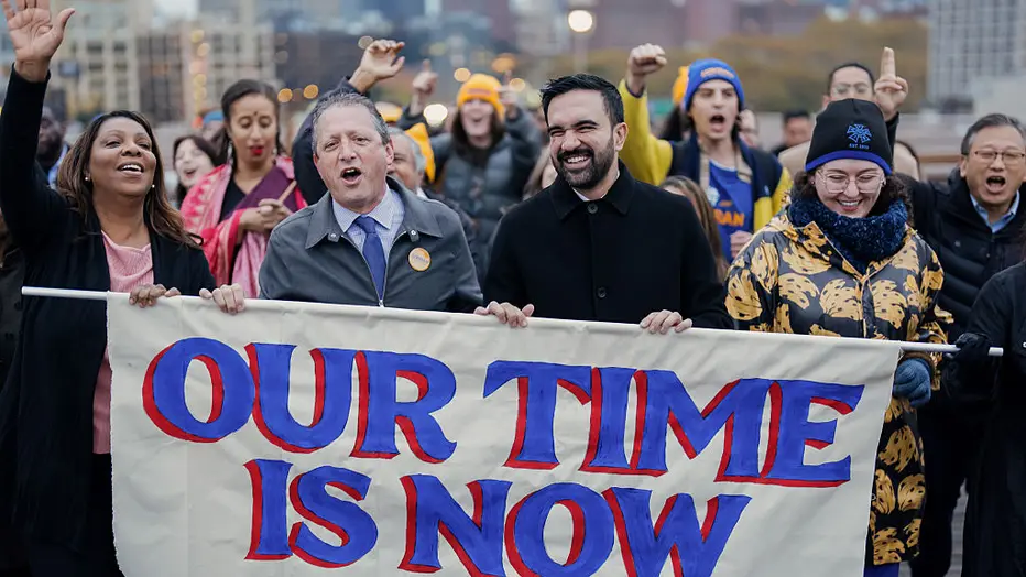 Zohran Mamdani, New York City mayoral candidate, center right, Letitia James, New York’s attorney general, left, and Brad Lander, New York City comptroller, second left, carry a banner across the Brooklyn Bridge in New York, US, on Monday, Nov. 3, 20