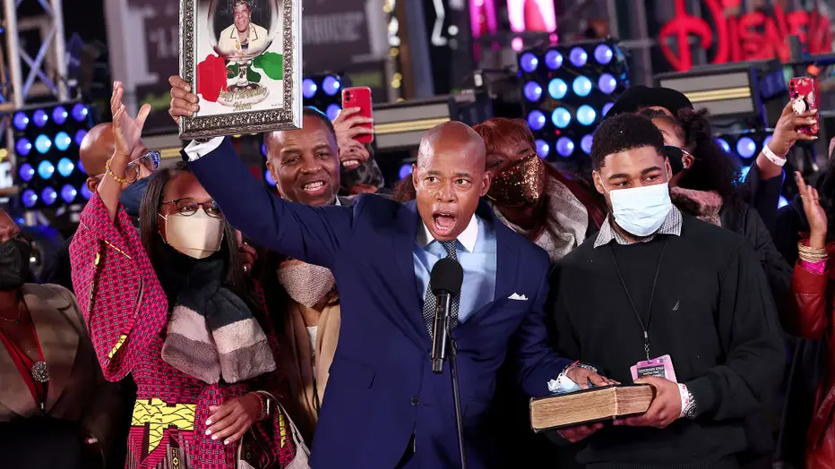 NEW YORK, NEW YORK – JANUARY 01: Eric Adams is sworn in as the 110th mayor of the city of New York on January 01, 2022 in New York, NY. Due to a surge in COVID-19 cases, the official inauguration has been postponed, and Adams chose to be sworn into o