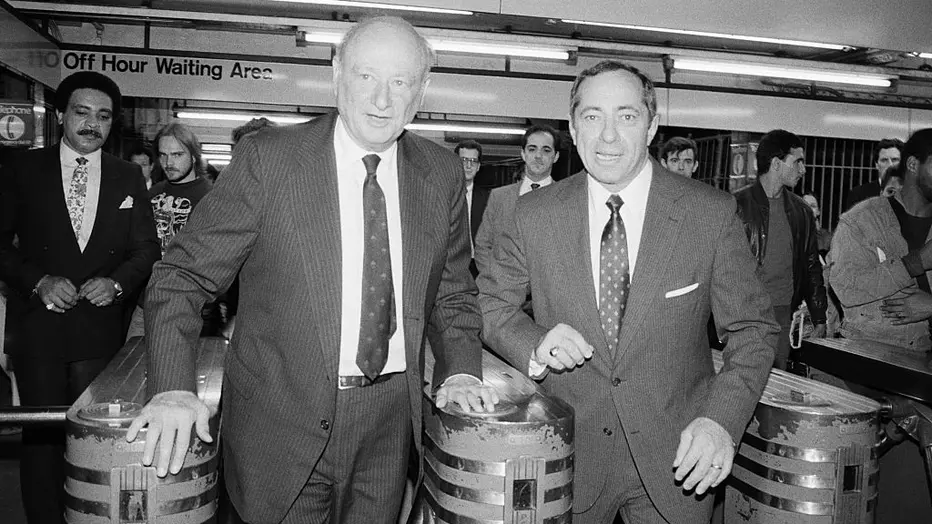 (Original Caption) 10/6/1986-New York, NY: Ready to tell the world that NYC has cleaned the graffiti off the city’s 3,000 subway car (it has 6,000), Ed Koch (l) and Mario Cuomo pass through the turnstile near City Hall for the familiar photo op. PH: